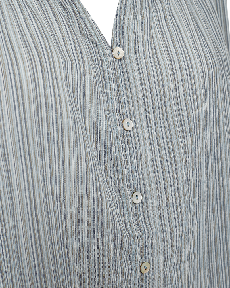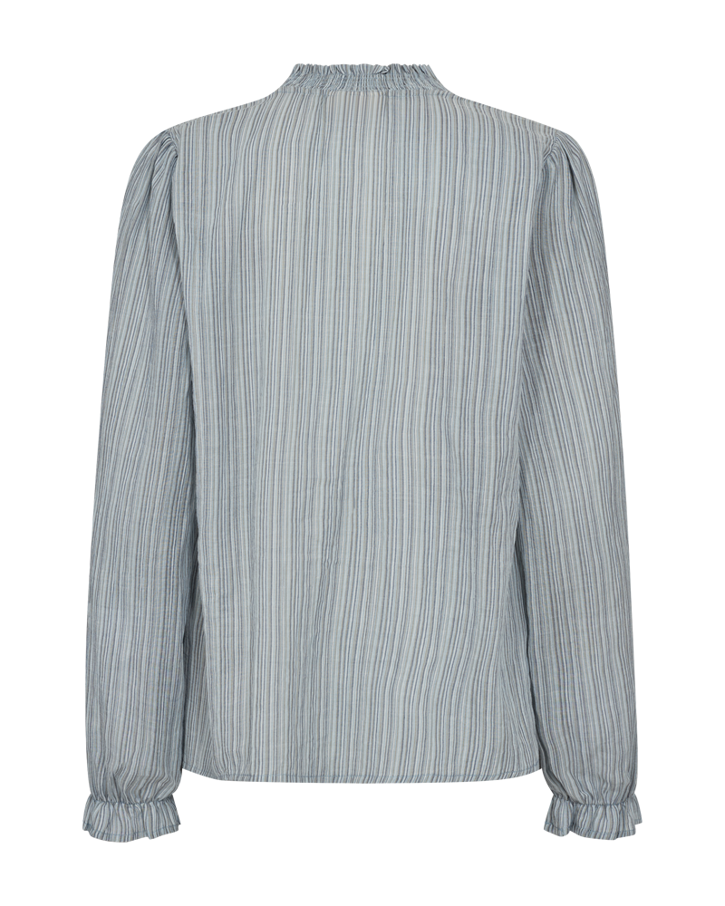 Bluse fra Freequent i en let kvalitet med yarndyed striber. Blusen er enkel i modellen med V-udskæring, perlemorsknapper på fronten, en fin krave med smock samt lange ærmer med flæsekant.