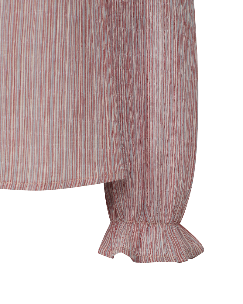 Bluse fra Freequent i en let kvalitet med yarndyed striber. Blusen er enkel i modellen med V-udskæring, perlemorsknapper på fronten, en fin krave med smock samt lange ærmer med flæsekant.