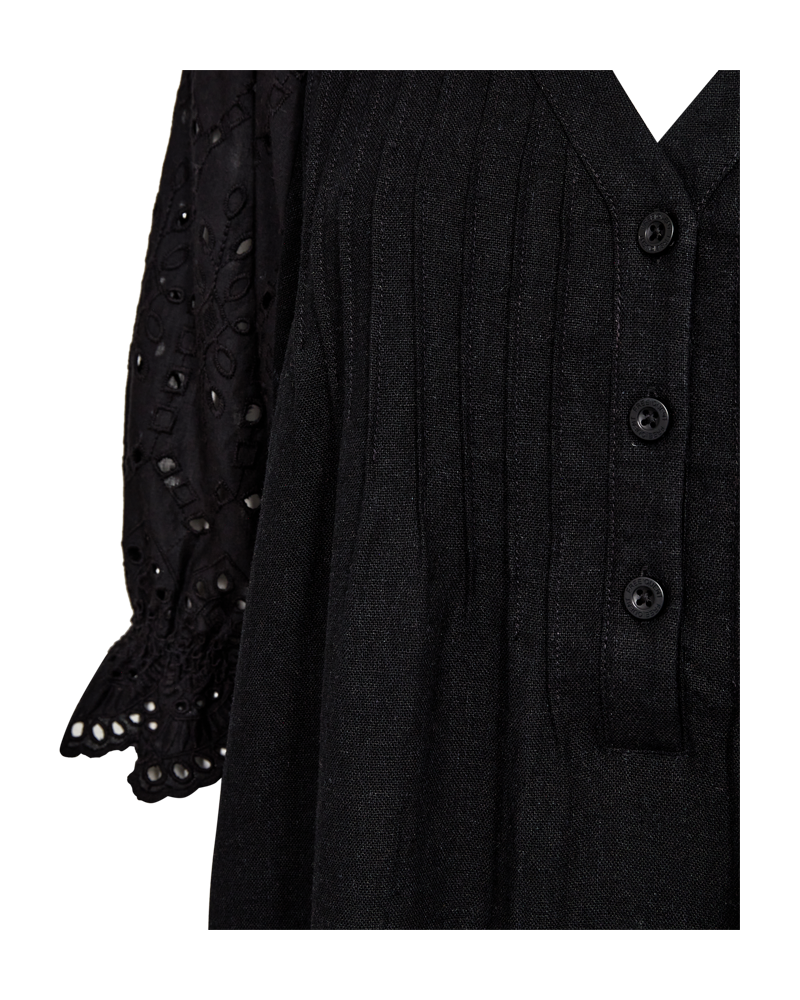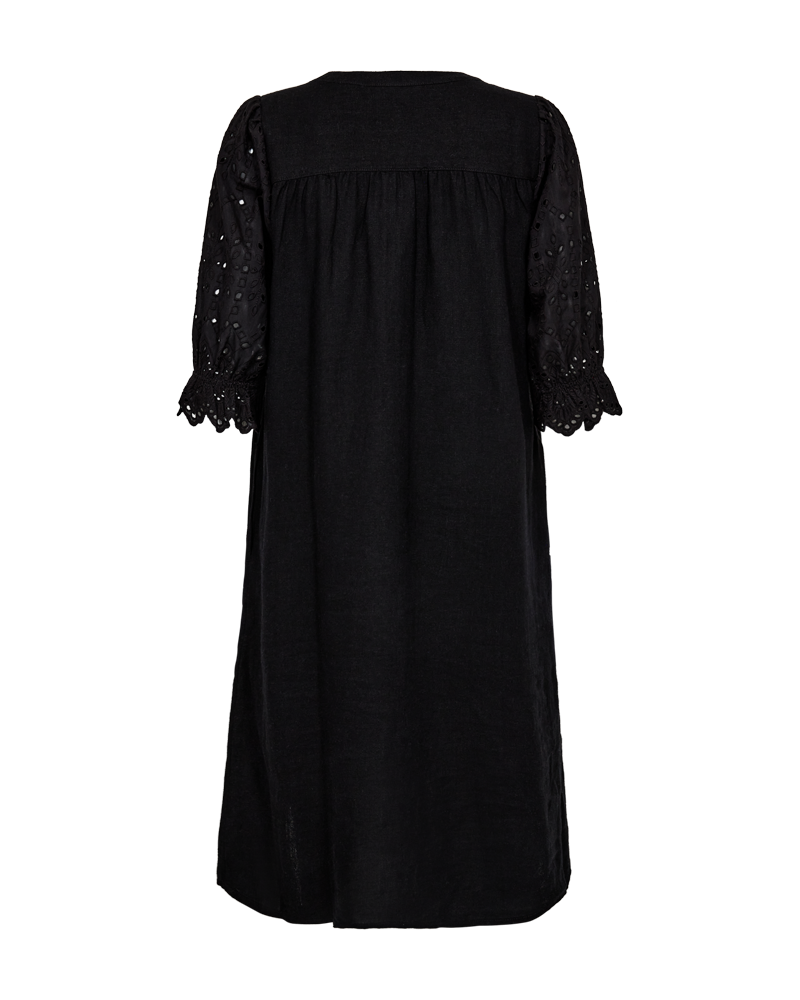 Kjole fra Freequent i en blød hørkvalitet. Kjolen har knaplukning, V-udskæring, læg front og bag, sidelommer samt halværmer med broderi anglaise og elastik cuff. Detaljer, der tilsammen giver kjolen et feminint udtryk.